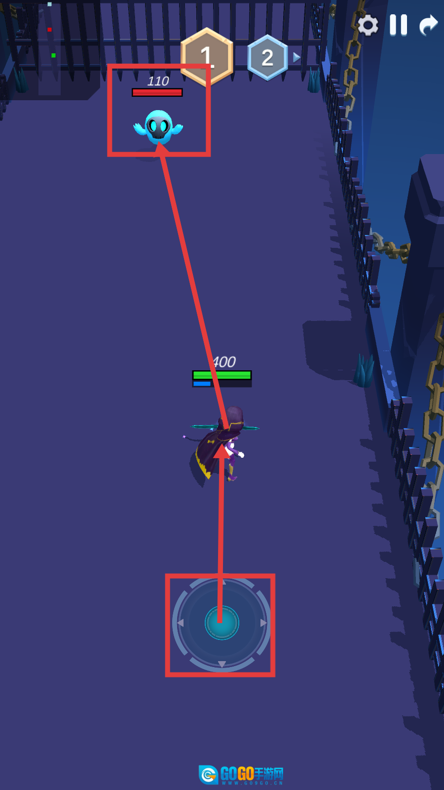2、战斗时操控下方轮盘移动角色,瞄准【110】血量的怪物攻击,注意走位躲避。