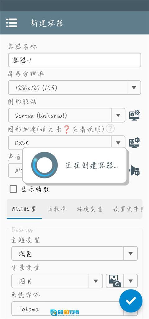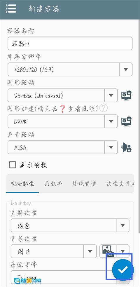 2、进入创建容器页面,点击右下角√图标。