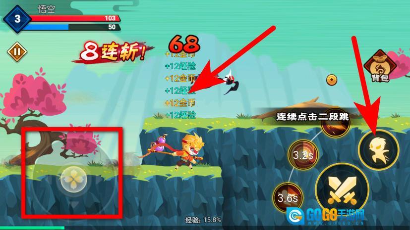 4、后续关卡中,操作移动键跨越地形,连续点击实现二段跳,灵活作战。