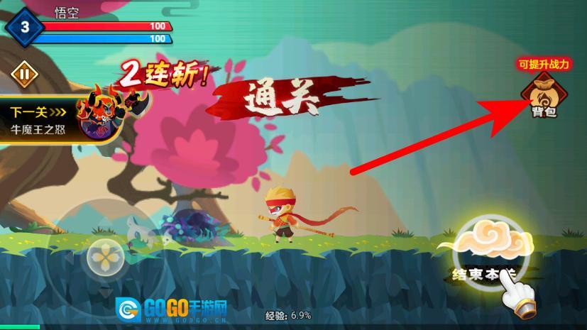 2、通关当前关卡后,点击结束本轮,点击进入背包界面准备强化角色。