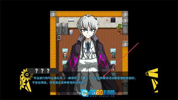 2、当前处于游戏剧情环节,查看角色关于毕业旅行的对话内容,推进该剧情即可继续解锁后续的游戏内容。
