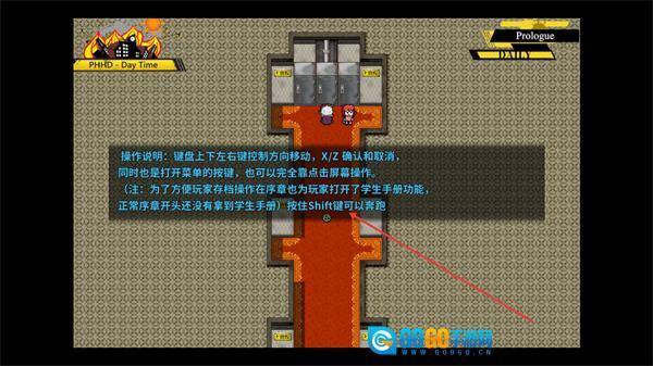 4、当前界面显示操作说明,用键盘上下左右键控移动,X/Z作确认取消,按住Shift可奔跑,也能点击屏幕操作。