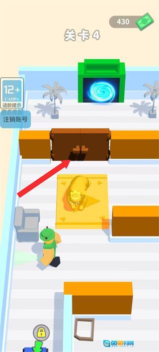 2、游戏里按照箭头的提示操作,引导角色去接触地毯或家具,完成伪装后角色会变成黄色,接着解开棕色的门锁,再通过匹配场景中的元素,来避开右侧追捕者的视线。
