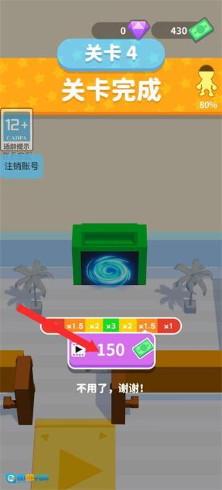 4、完成关卡后,你可以根据箭头提示选择观看广告以获得150奖励,也可以点击“不用了,谢谢”直接进入下一关。