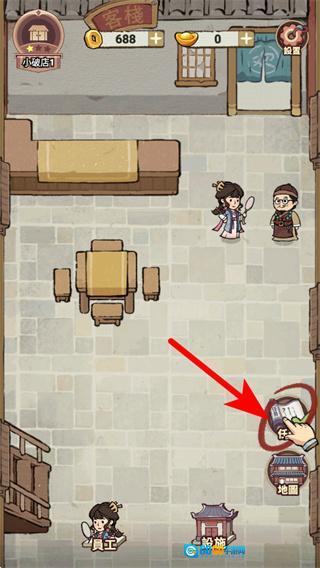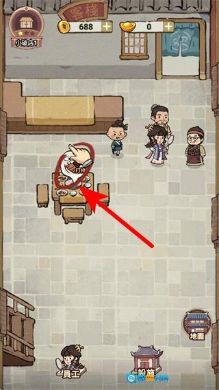 1、进入客堂界面后,点击箭头指向的餐桌区域打扫标识,这是清洁店铺的关键操作,点击才能完成餐桌清理。