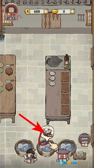 2、游戏中依照箭头指引,点击厨房区域的洗碗标识,完成餐具清洁流程,朝着维持店铺运营的目标前进。