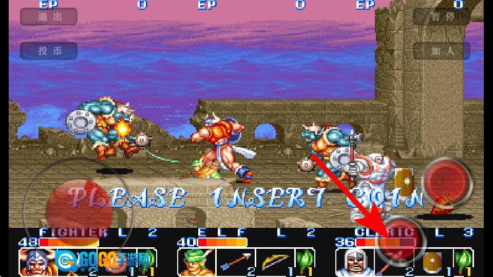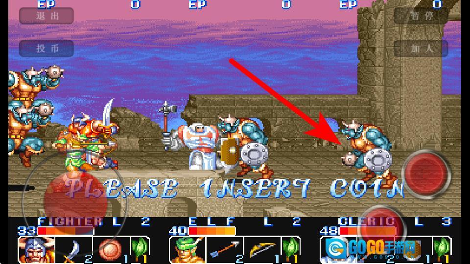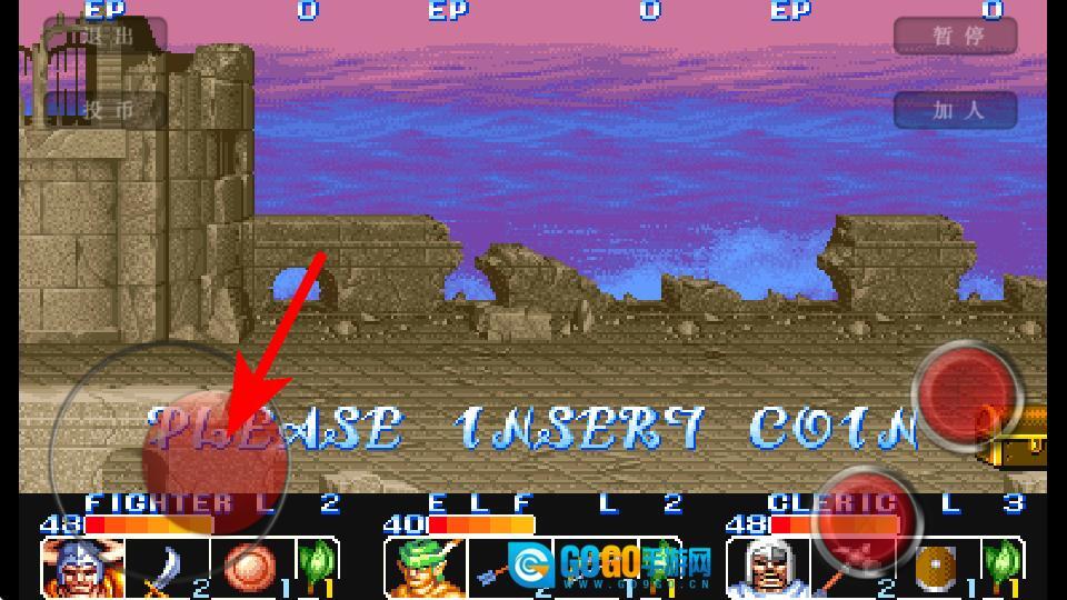 1、进入游戏界面后,点击箭头指向的投币按钮,这是开始游戏的关键操作,准确点击才能进入战斗关卡。