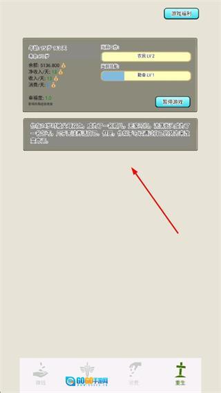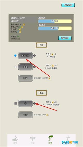 3、进入“消费”界面,用金币解锁住所和商品住所来提升幸福感,商品还能增加技能经验的收益。