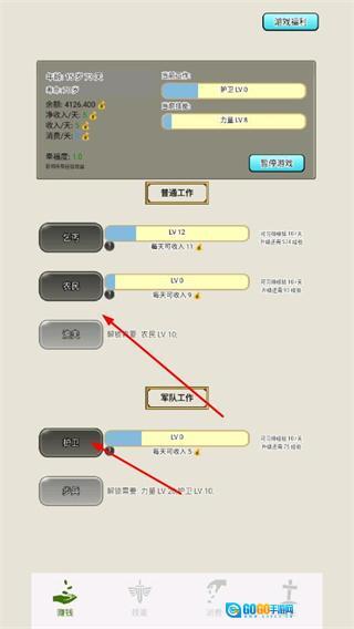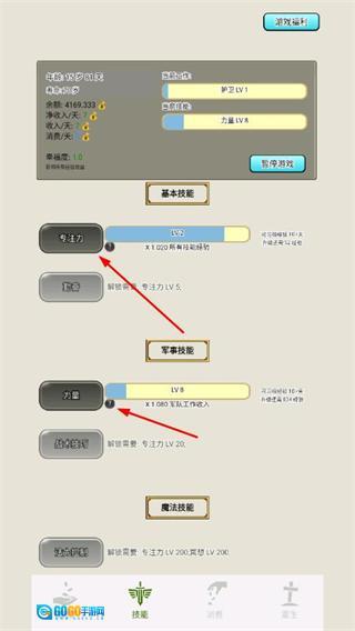技能与职业收益是直接挂钩的,专注力能够提升所有技能的经验,力量则会增加军队工作的收入,而技能等级决定了职业收益的上限;通过菜单可以直接将技能等级拉满,养成过程的反馈即时且强烈。