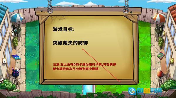 1、了解游戏目标为突破戴夫的防御,注意左上角临时卡牌会被新卡牌替换,开始准备对战。