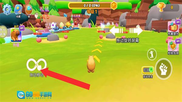 1、进入游戏后,拖动屏幕左侧的拖动移动按钮,控制角色在场景中移动,资源提升等级。