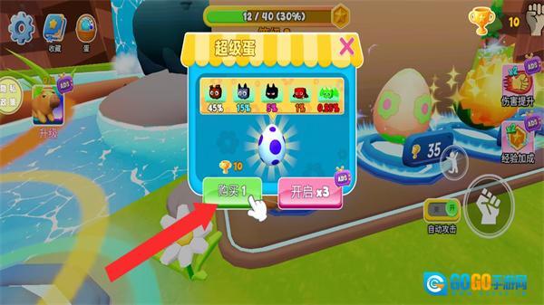 4、在超级蛋界面点击购买1按钮,消耗金币开启蛋,获取新角色或道具,增强游戏能力。