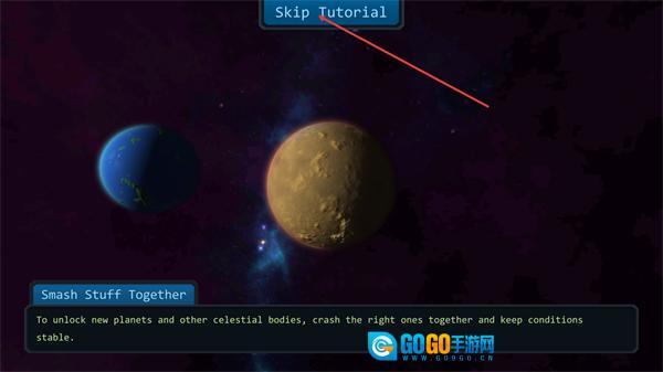 1、在教程界面可点击SkipTutorial跳过引导,也可按SmashStuffTogether提示,碰撞对应天体解锁新天体并维持状态稳定。