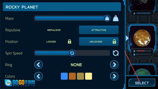3、在ROCKYPLANET的属性设置界面调整参数后,点击SELECT按钮,确认选择该天体用于后续流程。