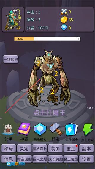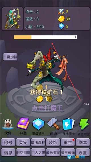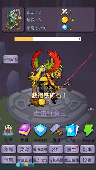 1、点击“打魔王”按钮攻击当前魔王,可获取铁矿石与金币,同时提升层数进度。