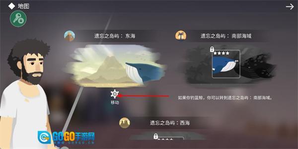 2、地图界面显示区域、点击移动按钮、可切换至目标海域推进钓鱼相关流程。