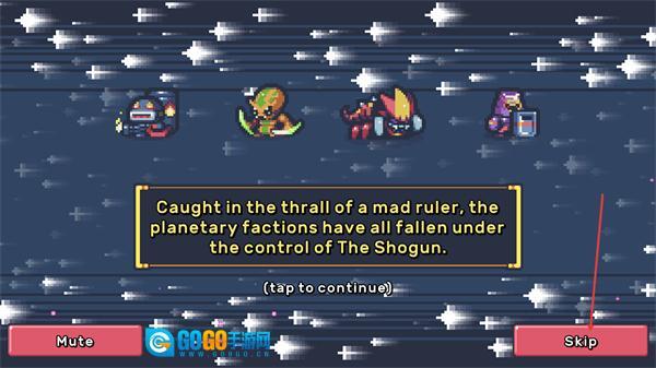 1、该界面展示游戏背景剧情,文字说明行星派系被疯狂统治者控制,点击界面或Skip按钮可跳过剧情,继续进入游戏流程。