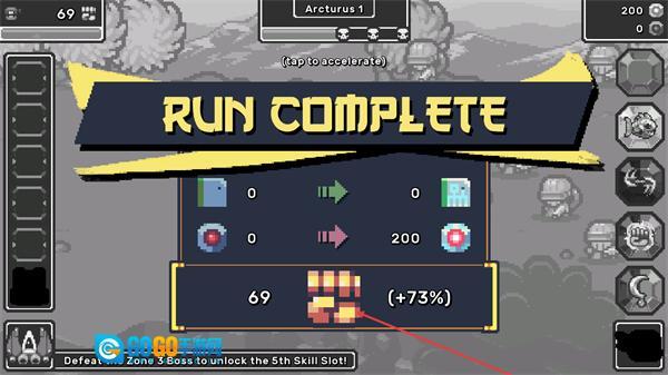 4、出现RUNCOMPLETE提示代表关卡完成,可查看本次获得的资源与进度提升,后续可挑战更高难度内容解锁新功能。