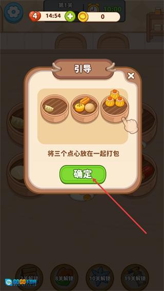 1、查看引导提示中的将三个点心放在一起打包说明,点击下方的确定按钮,即可关闭引导弹窗,开始该关卡的操作。