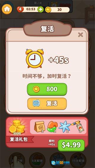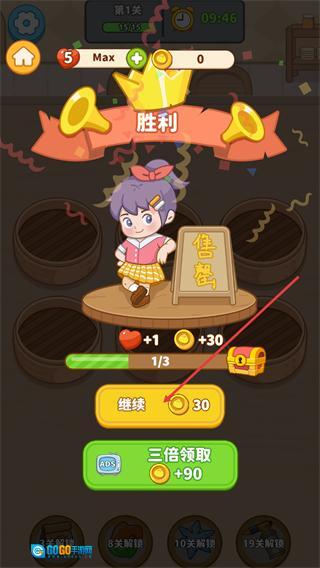 4、关卡完成后出现胜利界面,点击继续按钮,可领取30金币的奖励并进入下一关,也可选择三倍领取获取更多金币。