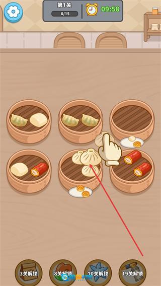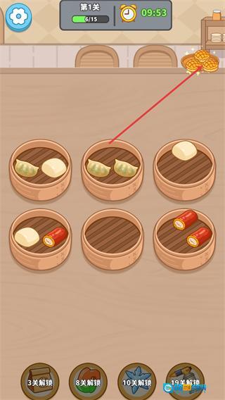 2、根据指引,将对应的点心移动到同一蒸笼内,完成三个同类点心的归置,以此推进关卡进度,逐步完成打包任务。