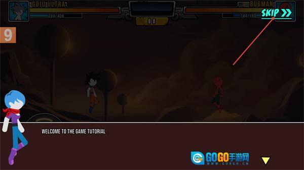 1、进入游戏后看到角色对话框提示,此时点击右上角的SKIP按钮,可跳过教程直接进入对战环节,快速开始游戏进程。