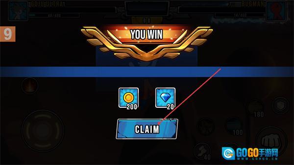 4、对战胜利后会出现YOUWIN提示,此时点击下方的CLAIM按钮,即可领取200金币与20钻石的奖励,完成该关卡的结算。