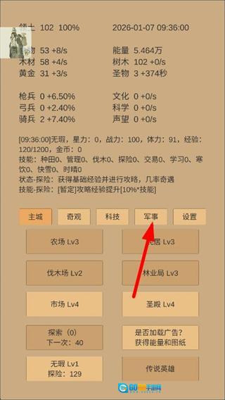 3、点击军事标签,解锁军事建筑与兵种,以此提升城邦的战力。