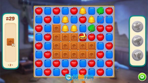 1、消除木板图案,积累左侧进度条,同时触发特效道具如爆炸类批量消除图案。