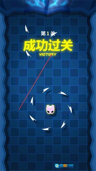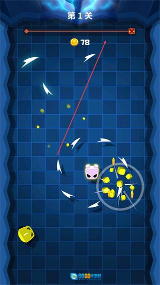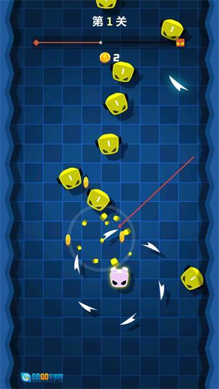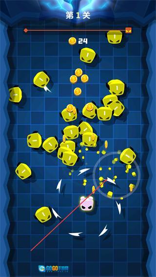 1、在第1关操控粉色角色旋转,撞击黄色数字块,收集金币,推进关卡进度。