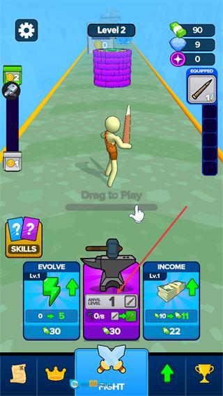 1、在Level2关卡界面,可消耗资源升级ANVIL至对应等级,升级后能提升道具打造效率,同时通过DragtoPlay操控角色移动,点击FIGHT可进入战斗环节推进关卡。