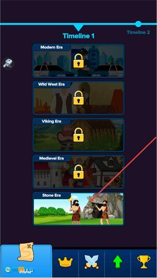 2、在时代选择界面,初始解锁StoneEra,其他如MedievalEra、VikingEra等地图处于锁定状态,需完成对应条件解锁,不同时代对应不同关卡与玩法。