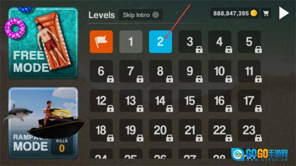 1、在关卡选择界面,点击已解锁的2号关卡即可进入对应关卡,同时可选择左侧FREEMODE或RAMPAGEMODE切换游戏模式,未解锁关卡需完成前置关卡才能开启。