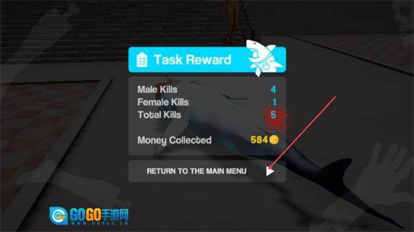 4、关卡完成后显示TaskReward界面,可查看MaleKills、FemaleKills等数据及获得的金币,点击RETURNTOTHEMAINMENU按钮即可返回主界面,准备进入下一个关卡。