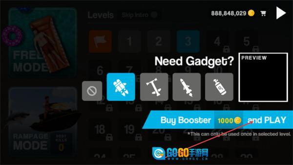 2、选择关卡后弹出NeedGadget界面,点击BuyBooster按钮消耗1000金币购买增益道具,即可进入关卡,该道具单关卡仅能使用一次,可提升鲨鱼的关卡表现。