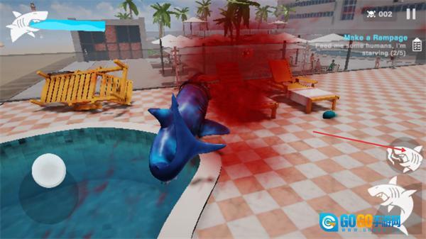 3、在关卡中,当前任务是Feedmesomehumans.I'mstarving2/5,操控鲨鱼靠近人类,点击右侧攻击按钮完成捕食,推进任务进度至目标数量。