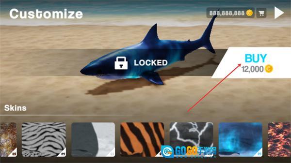1、在Customize界面中,该鲨鱼皮肤处于LOCKED状态,点击右侧BUY按钮,消耗12000金币即可解锁该皮肤,也可选择下方其他皮肤样式进行更换。
