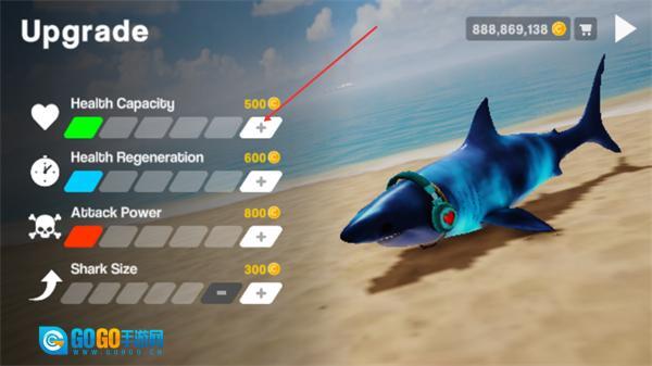 2、进入Upgrade界面,可消耗对应金币提升鲨鱼属性,点击HealthCapacity旁的加号键,花费500金币提升生命值上限,以此增强鲨鱼的生存能力。