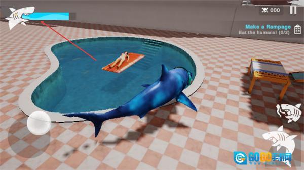 3、在游戏关卡中,操控鲨鱼靠近泳池内的人类,当鲨鱼在陆地上行动时,要注意左上角的氧气值,如果氧气值不足请及时回到水中。