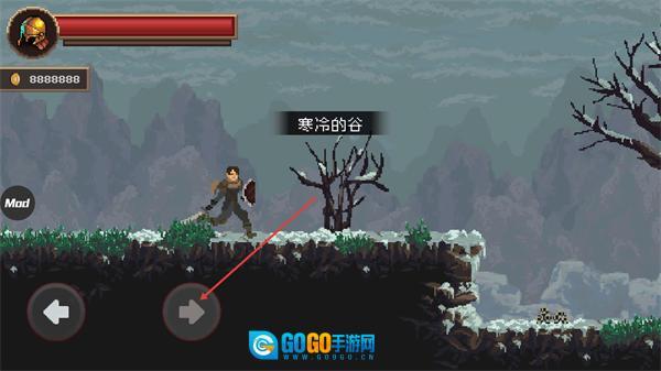 2、进入寒冷的谷场景后,通过左右方向按钮操控角色移动,在雪地与山地结合的关卡场景中探索,推进冒险流程,同时留意上方的资源与状态显示。