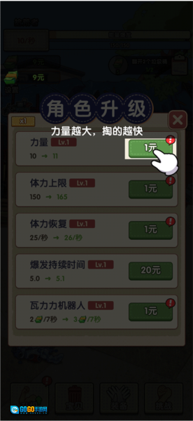 2.点击屏幕左下角的【升级】按钮,花费金币来提升角色的【力量】、【体力上限】等各项属性。完成升级后,角色的翻找效率和行动力都将得到提升。
