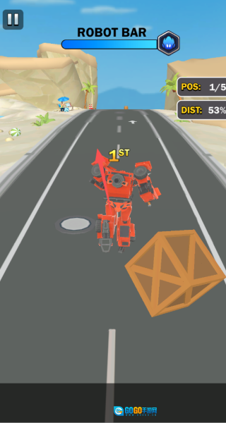 3、当赛车处于高速行驶状态时,玩家可通过点击按钮使其切换为不同的机甲形态,以此来应对包含跳跃、撞击在内的各类特殊赛道挑战。