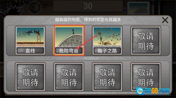 1、选择【危险弯道】地图,该地图越高级奖励越多,开启火柴人驾驶挑战以获取丰厚奖励。