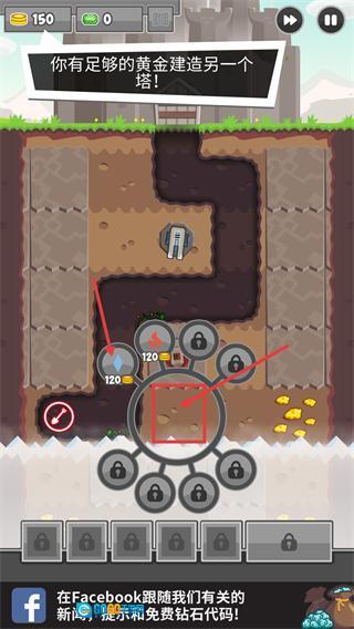 3、当金币充足时,选择合适的塔(如消耗120金币的功能塔)进行建造,强化防御火力,阻断敌人行进路径。