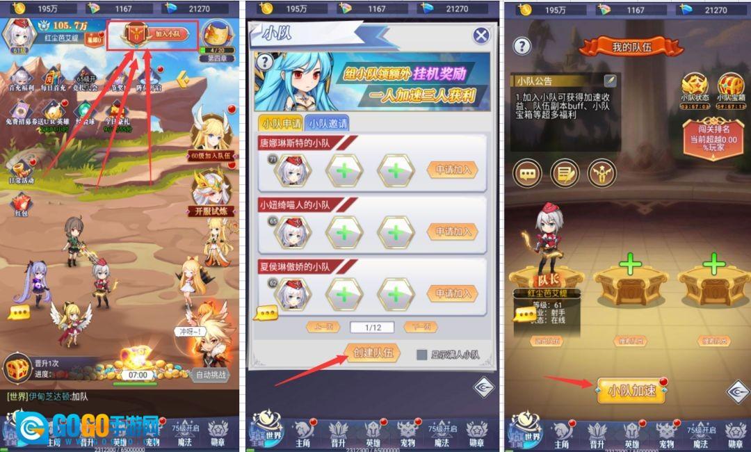 要是所有关卡挑战都打完了还没到60级,可以这样做:打开【主城页面】,点击右上角的【加入小队】,花50000金币【创建队伍】,然后点一下【小队加速】,就能拿到相当于两小时离线挂机的经验,这样就能升到60级,之后就可以加入别人的公会啦(见下图)