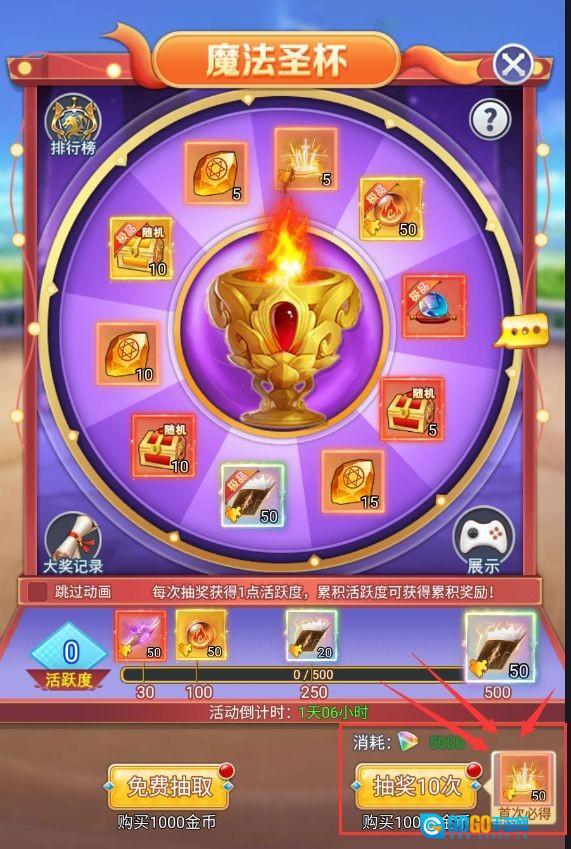 4.【道具抽奖活动】:每次抽奖需消耗5000彩钻,像【魔法圣杯】这类活动都适用;每个活动的首次10连抽必能拿到50个对应道具碎片(宝具、魔法类碎片等),这个首次10连建议抽一次,大家要合理规划彩钻;充值玩家若钻石相对充裕,建议抽满30次,能额外获得红碎片*50。