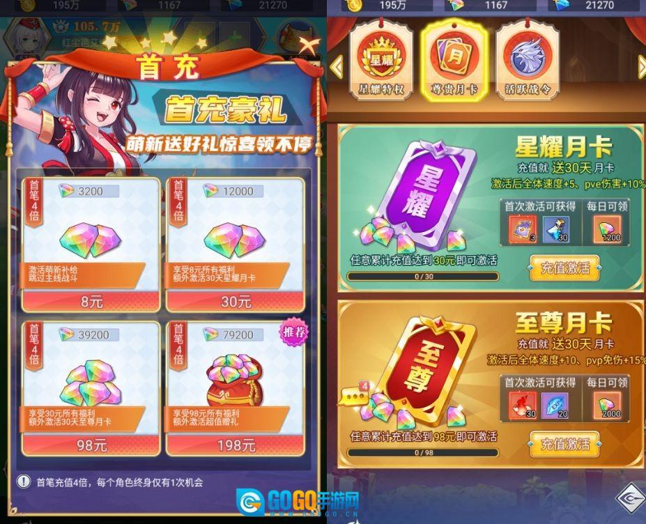 2.进阶充值建议:【98元首充】(首充4倍钻石是唯一一次机会,若选择此档位就无需先充8元档了),累计充值到对应金额时,可一并开通30元至尊月卡与98元星耀月卡(每日均可领取钻石),另外还有价值100元的首充奖励能连续领3天,这个也很划算。