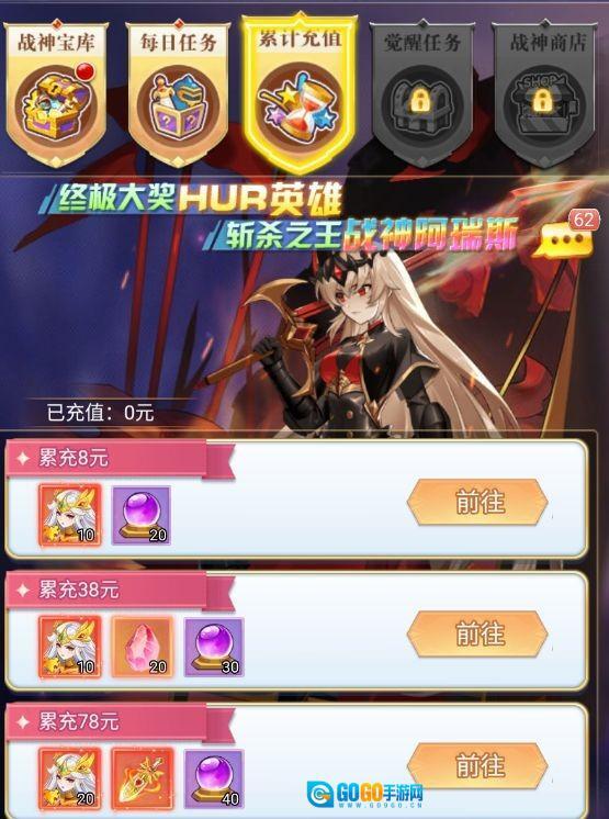 2. 要是各位大佬,不妨关注下【战神崛起】活动,着手考虑入手首个HUR女神——战神阿瑞斯。累充还会附赠炽天使碎片、胜利女神碎片和战神阿瑞斯碎片。炽天使这个女神是真的强!每次战斗结束看输出就能明白;胜利女神则是爬塔的利器,试炼塔后期基本就靠她了。后面没什么特别的内容,前期过渡想获取最优资源,就得依靠她们俩。