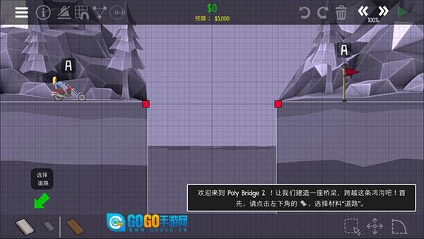 1、欢迎来到桥梁建筑师的世界!现在,让我们动手搭建一座桥梁,跨越眼前这条深深的鸿沟吧!第一步,你需要点击左下角的材料选项,从中选择道路材料来开始建造。