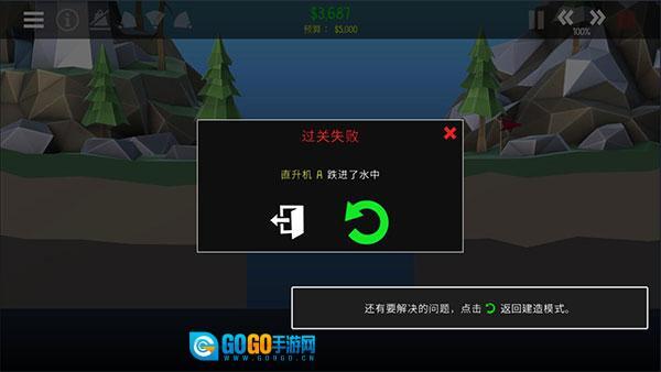 8、依然是过关失败,直升机A坠入水中,还有待解决的问题,点击绿色返回按钮,再次回到建造模式。